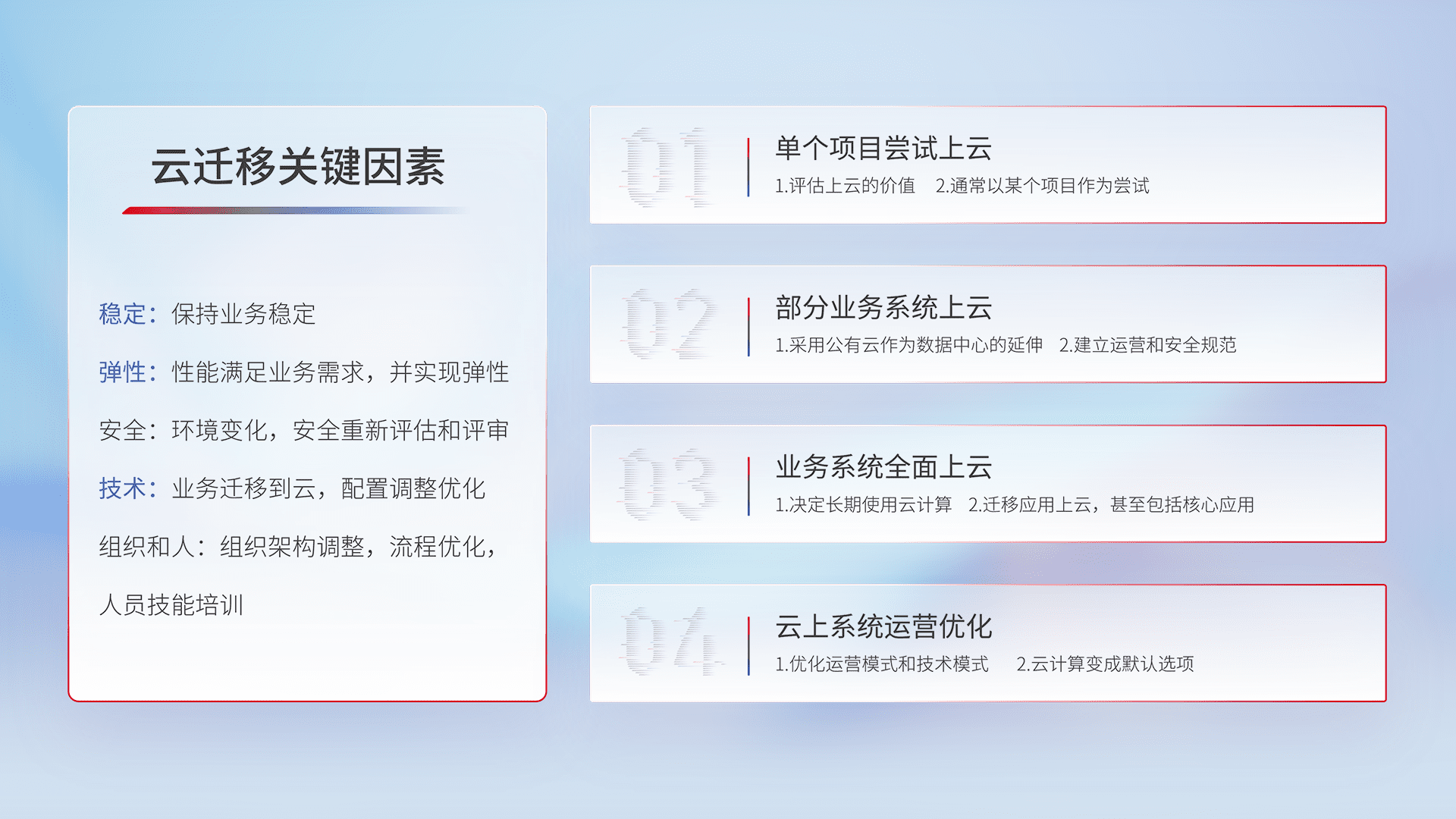 结合实际业务,,,从规划设计、、、、云平台选型、、云原生改造、、、数据迁移、、、、集成交付,,,,迁移全过程为客户识别最佳上云路径,,做好风险识别管理,,,设计网络架构、、、、身份权限、、、、安全审计合规、、、、操作审计、、、、日志审计、、、、监控告警策略、、、多站点容灾设计等,,对云上基础设施进行整体规划,,,提升IT治理水平,,,,以满足弹性、、、高可用、、、、高性能的需求。。