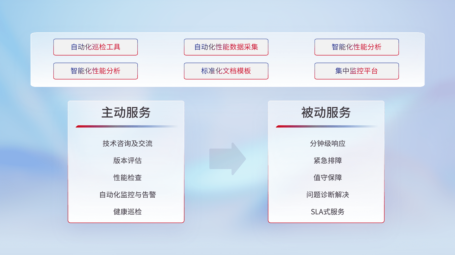 智能化工具和标准化文档,,,保障服务质量,,提供主动服务(包含技术咨询、、、版本评估、、、性能检查、、、自动化监控与告警、、、健康巡检)和被动服务包含(分钟级响应、、紧急排障、、、、值守保障、、问题诊断解决、、SLA服务)。。